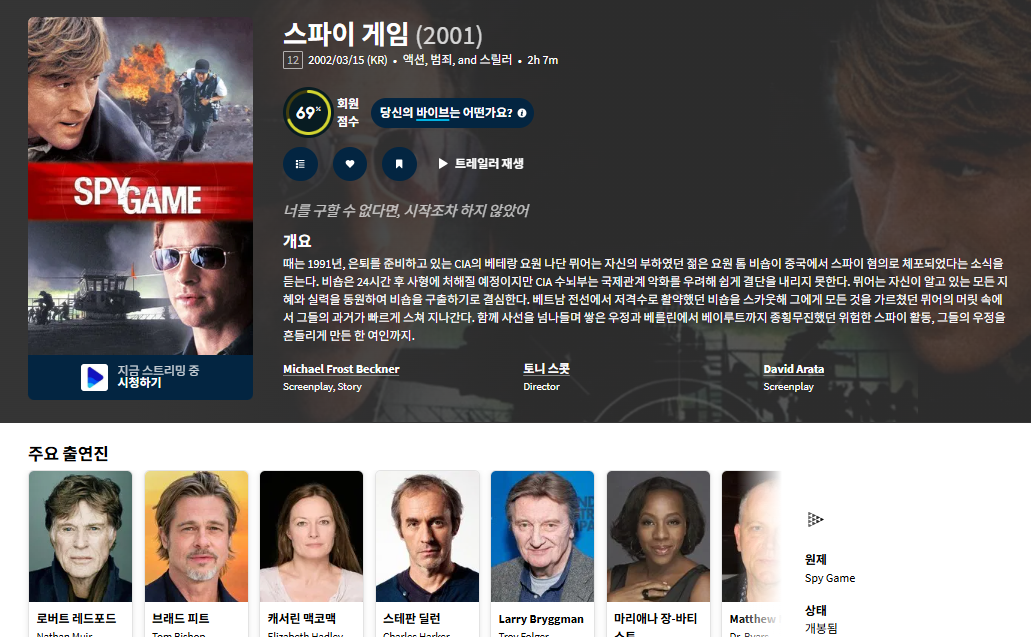 movie 영화 큐레이터 로버트 레드포드 [큐레이터] 로버트 레드포드 브레드 피트 [스파.. person ru*** calendar_today 2026.03.31 visibility 4,677 다운로드 2개 파일 folder_zip 스파이 게임.Spy.Game.2001.HD720p.mkv 2.0 GB download folder_zip 스파이 게임.Spy.Game.2001.HD720p.smi download