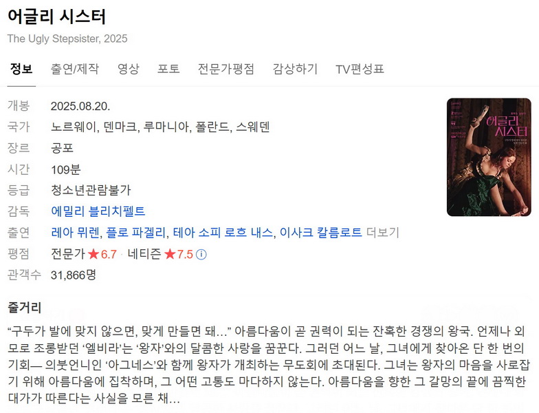 movie 영화 어글리 시스터 Ugly 어글리 시스터 The Ugly Stepsister 2025 한글자막 person 로망*** calendar_today 2026.03.31 visibility 4,376 다운로드 2개 파일 folder_zip The Ugly Stepsister 2025 1080p.mkv 5.8 GB download folder_zip The Ugly Stepsister 2025 1080p.srt download