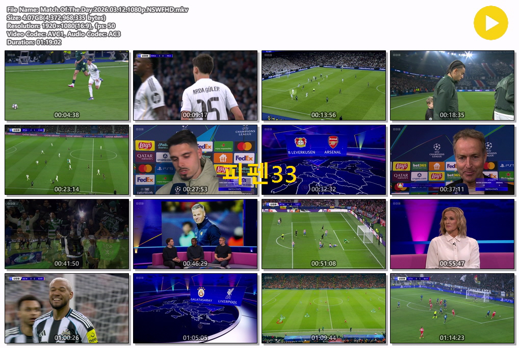 play_circle 동영상 UCL 16강 Match [핖.UCL] 26.03.12 16강 G1 M.O.T.D [1080P.FHD] person MJ*** calendar_today 2026.03.31 visibility 5,526 다운로드 1개 파일 folder_zip Match.Of.The.Day.2026.03.12.1080p.NSWFHD.mkv 4.1 GB download