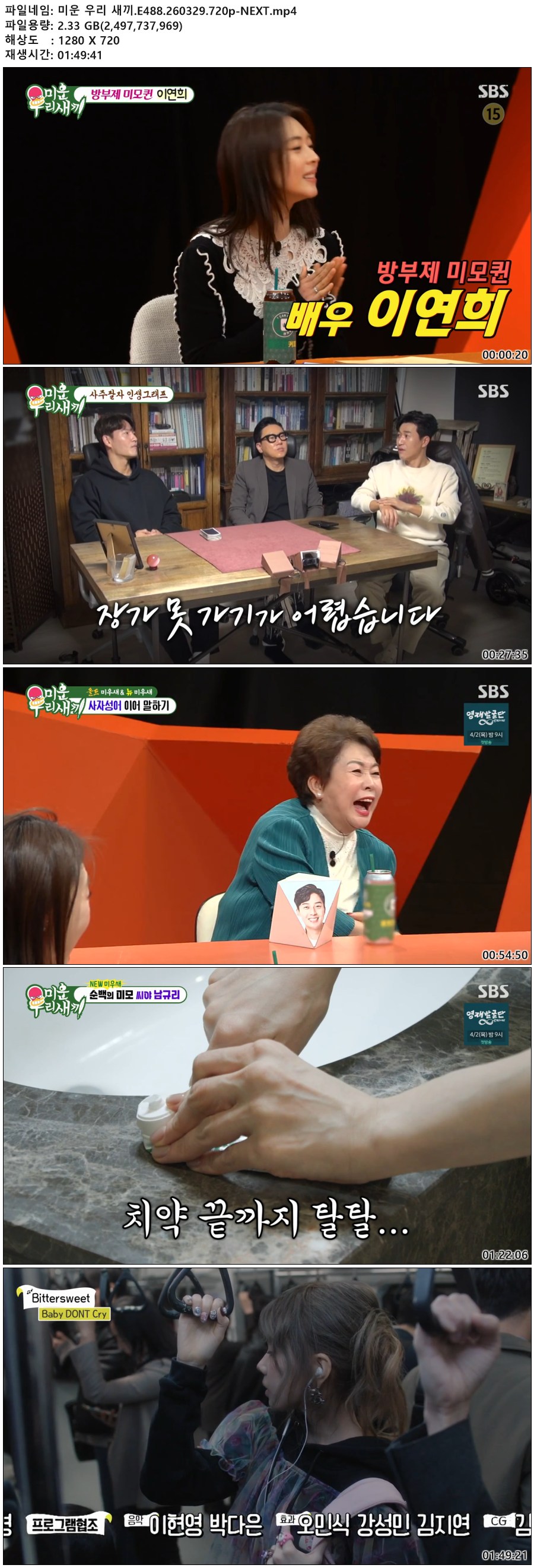 play_circle 동영상 미운 우리 새끼 미운 우리 새끼.E488.260329.720p-NEXT person qk*** calendar_today 2026.03.31 visibility 7,834 다운로드 1개 파일 folder_zip 미운 우리 새끼.E488.260329.720p-NEXT.mp4 2.3 GB download