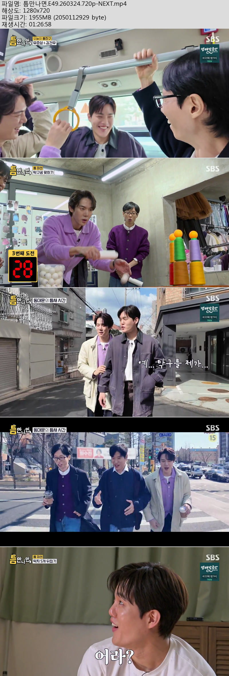 play_circle 동영상 틈만나면 E49 NEXT 틈만나면.E49.260324.720p-NEXT person kk*** calendar_today 2026.03.31 visibility 5,948 다운로드 1개 파일 folder_zip 틈만나면.E49.260324.720p-NEXT.mp4 1.9 GB download