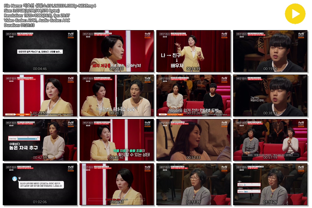 play_circle 동영상 이호선 상담소 E11 이호선 상담소.E11.260331.1080p-NEXT person se*** calendar_today 2026.03.31 visibility 5,920 다운로드 1개 파일 folder_zip 이호선 상담소.E11.260331.1080p-NEXT.mp4 3.1 GB download