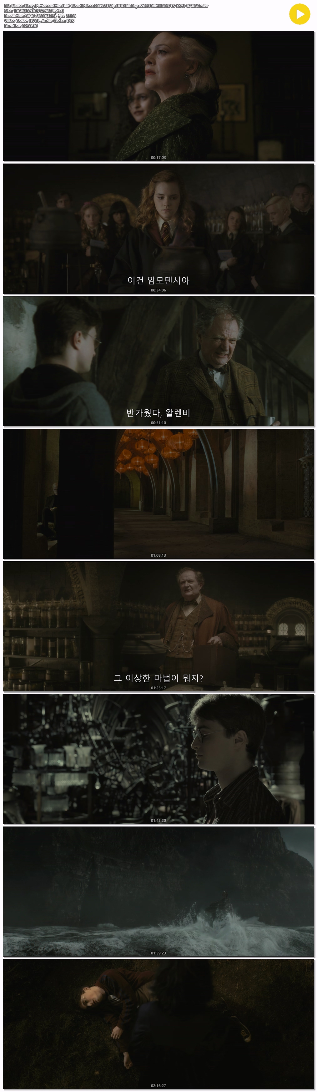 movie 영화 해리 포터6 혼혈 [4k] 해리 포터6 혼혈 왕자 .2009.2160p.UHD.BluRay.x265.10bit.HDR.DTS-X.7.1 person ro*** calendar_today 2026.04.01 visibility 3,233 다운로드 2개 파일 folder_zip Harry.Potter.and.the.Half-Blood.Prince.2009.2160p.UHD.BluRay.x265.10bit.HDR.DTS-X.7.1-RARBG.mkv 13.0 GB download folder_zip Harry.Potter.and.the.Half-Blood.Prince.2009.2160p.UHD.BluRay.x265.10bit.HDR.DTS-X.7.1-RARBG.smi download