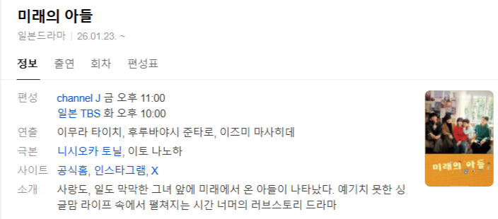 tv 드라마 미래의 아들 E08 미래의 아들.E08-E09.TVING.WEB-DL.1080p.H.264.AAC2.0 person iq*** calendar_today 2026.04.01 visibility 6,922 참고; 영상자체 한글자막 다운로드 2개 파일 folder_zip 미래의.아들.S01E08.TVING.WEB-DL.1080p.H.264.AAC2.0.mkv 2.4 GB download folder_zip 미래의.아들.S01E09.TVING.WEB-DL.1080p.H.264.AAC2.0.mkv download