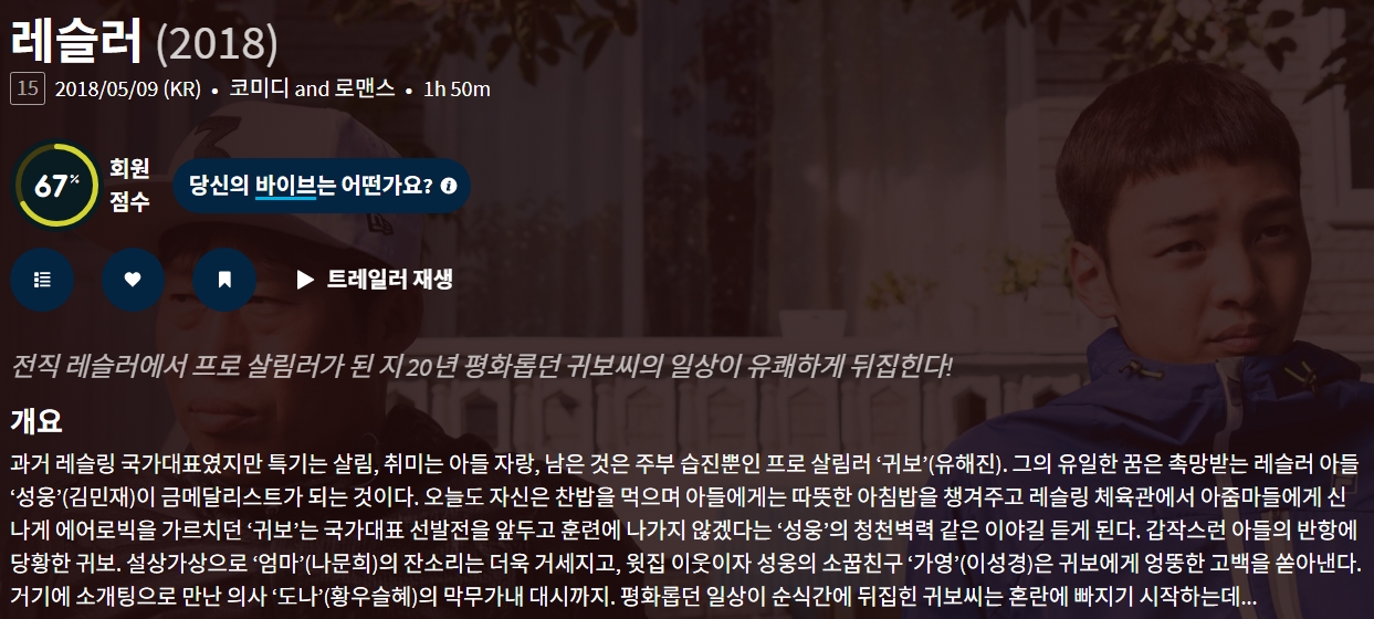 movie 영화 레슬러 전직 레슬러에서 레슬러 "전직 레슬러에서 프로 살림러가 된 지 20년 평화롭던 귀보씨의 일상이 유쾌하게 뒤집힌다!" person gg*** calendar_today 2026.04.10 visibility 6,619 다운로드 1개 파일 folder_zip 레슬러.mkv 2.0 GB download