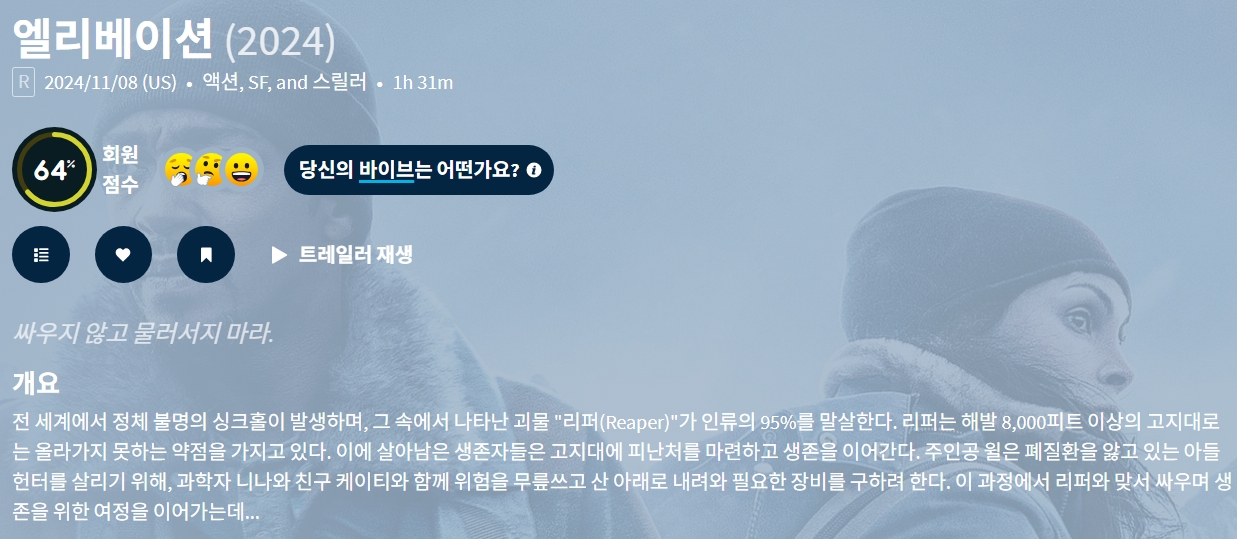 movie 영화 엘리베이션 해발 000피트 엘리베이션 "해발 8,000피트. 저 괴물들이 올라오지 못하는 유일한 희망의 선이다." person gg*** calendar_today 2026.04.11 visibility 6,218 다운로드 1개 파일 folder_zip 엘리베이션.mkv 1.3 GB download