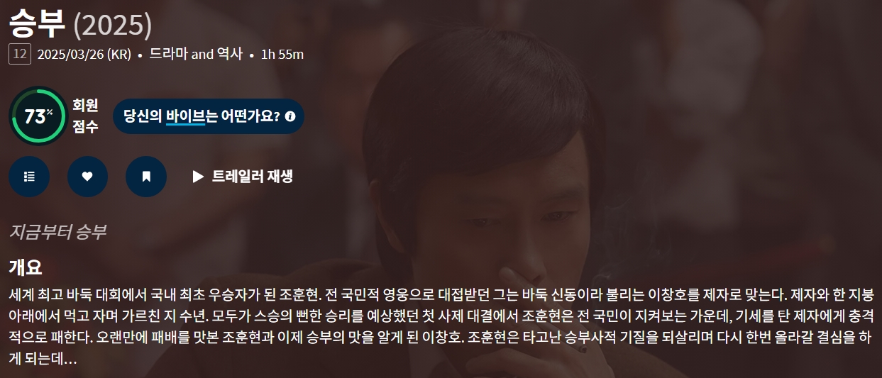 movie 영화 승부 바둑판 위의 승부 (2025) 바둑판 위의 사제 대결, 스승의 노련함과 제자의 기세가 충돌하다 person gg*** calendar_today 2026.04.11 visibility 3,333 다운로드 1개 파일 folder_zip 승부 (2025).mkv 1.7 GB download