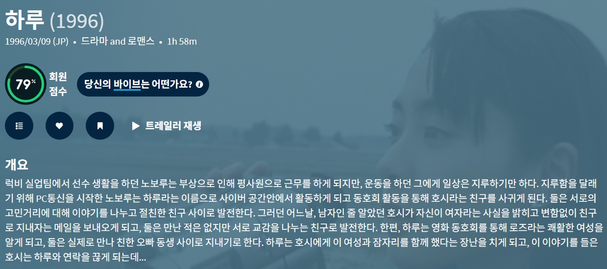 movie 영화 하루 PC통신으로 교감하는 하루 "PC통신으로 교감하는 남녀의 사랑" person gg*** calendar_today 2026.04.11 visibility 5,198 다운로드 2개 파일 folder_zip 하루.mkv 1.2 GB download folder_zip 하루.srt download