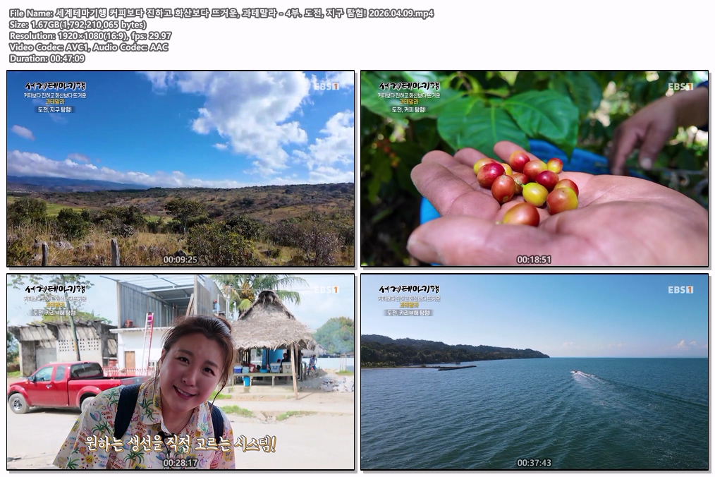 play_circle 동영상 세계테마기행 커피보다 진하고 세계테마기행 커피보다 진하고 화산보다 뜨거운, 과테말라 - 4부. 도전, 지구 탐험! 2026.04.09 person he*** calendar_today 2026.04.11 visibility 6,240 다운로드 1개 파일 folder_zip 세계테마기행 커피보다 진하고 화산보다 뜨거운, 과테말라 - 4부. 도전, 지구 탐험! 2026.04.09.mp4 1.7 GB download