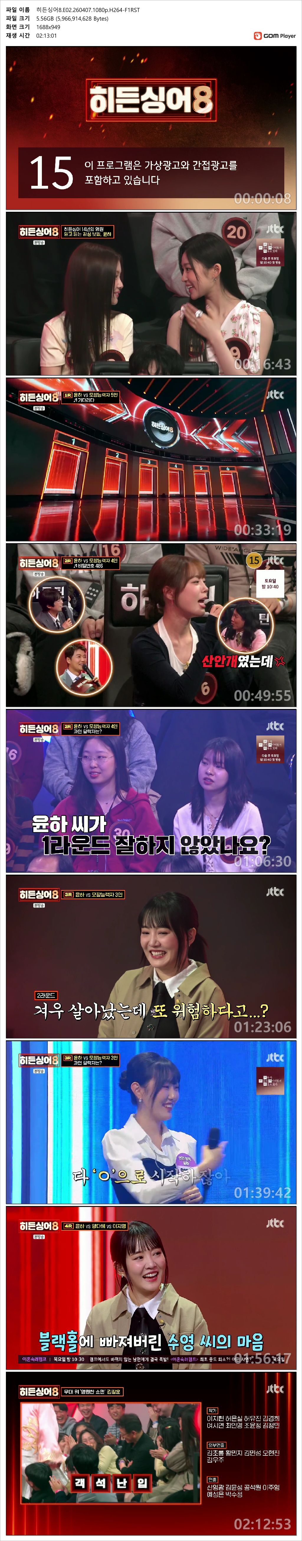 play_circle 동영상 JTBC 히든싱어8 감성 [JTBC] 히든싱어8 (감성 보컬 - 윤하).E02.260407.1080p.H264-F1RST person 도리*** calendar_today 2026.04.11 visibility 7,219 다운로드 1개 파일 folder_zip 히든싱어8.E02.260407.1080p.H264-F1RST.mp4 5.6 GB download
