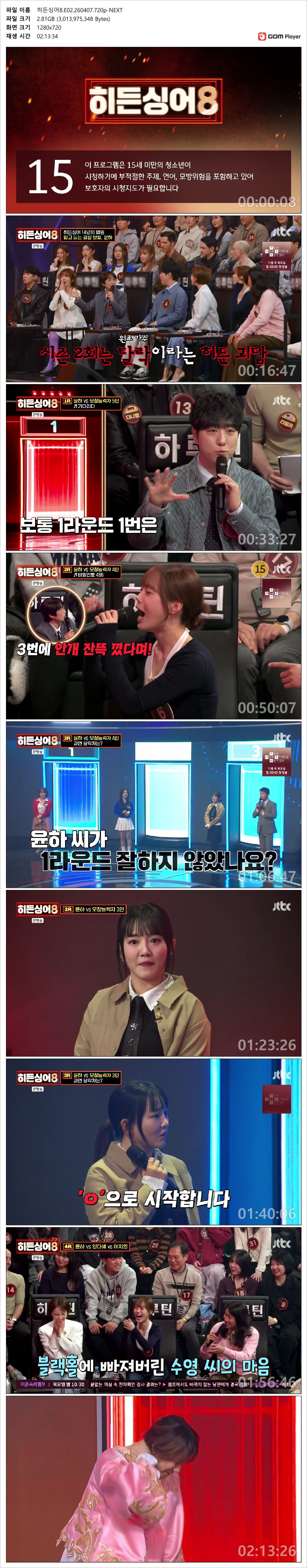 play_circle 동영상 JTBC 히든싱어8 감성 [JTBC] 히든싱어8 (감성 보컬 - 윤하).E02.260407.720p-NEXT person 도리*** calendar_today 2026.04.11 visibility 5,551 다운로드 1개 파일 folder_zip 히든싱어8.E02.260407.720p-NEXT.mp4 2.8 GB download