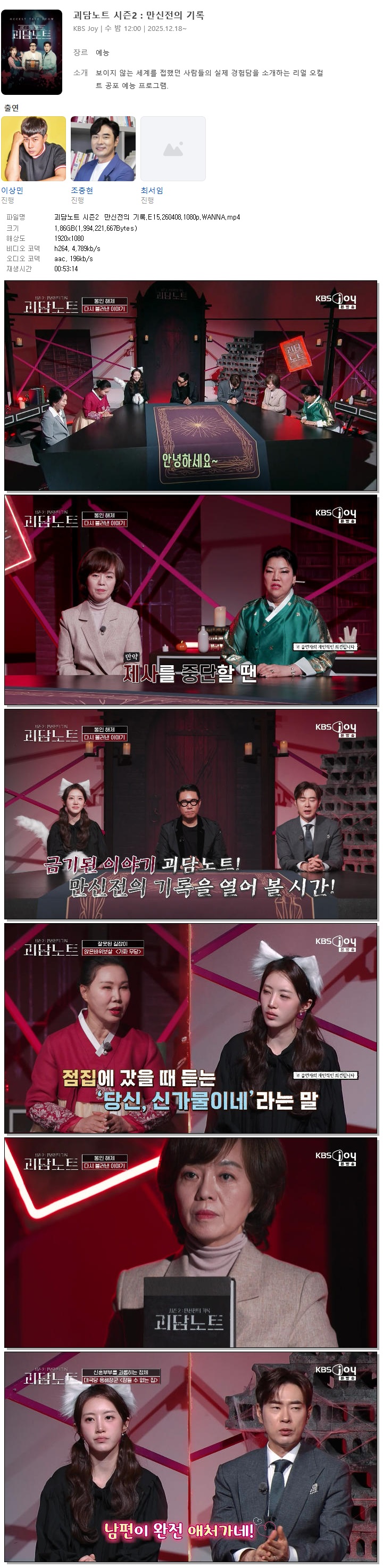play_circle 동영상 괴담노트 시즌2 만신전의 괴담노트 시즌2 만신전의 기록.E15.260408.1080p.WANNA person 홀리*** calendar_today 2026.04.11 visibility 5,783 다운로드 1개 파일 folder_zip 괴담노트 시즌2 만신전의 기록.E15.260408.1080p.WANNA.mp4 1.9 GB download