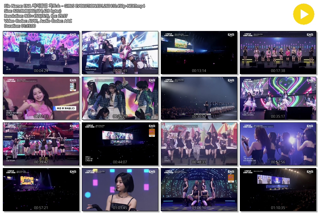 play_circle 동영상 ENA 케이팝업 차트쇼 ENA 케이팝업 차트쇼 - GIRLS EVOLUTION.E01.260410.450p-NEXT person se*** calendar_today 2026.04.11 visibility 7,149 다운로드 1개 파일 folder_zip ENA 케이팝업 차트쇼 - GIRLS EVOLUTION.E01.260410.450p-NEXT.mp4 821 MB download