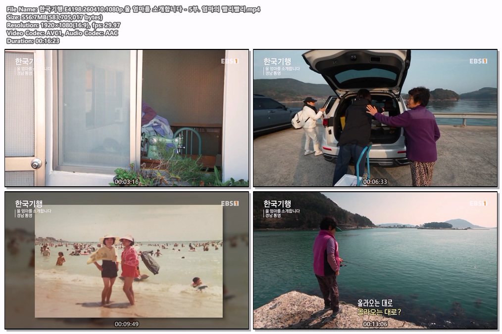 play_circle 동영상 한국기행 E4198 엄마를 한국기행.E4198.260410.1080p.울 엄마를 소개합니다 - 5부. 엄마의 빨리빨리 person he*** calendar_today 2026.04.11 visibility 5,815 다운로드 1개 파일 folder_zip 한국기행.E4198.260410.1080p.울 엄마를 소개합니다 - 5부. 엄마의 빨리빨리.mp4 557 MB download