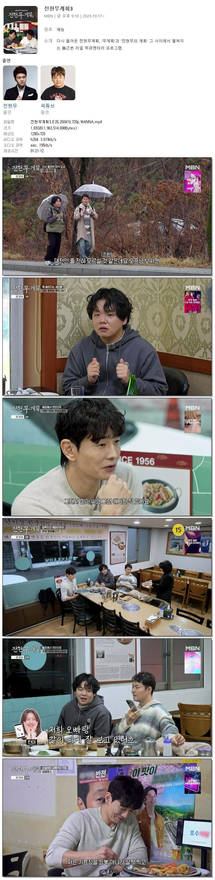 play_circle 동영상 전현무계획3 E26 WANNA 전현무계획3.E26.260410.720p.WANNA person 바오*** calendar_today 2026.04.11 visibility 3,257 다운로드 1개 파일 folder_zip 전현무계획3.E26.260410.720p.WANNA.mp4 1.8 GB download