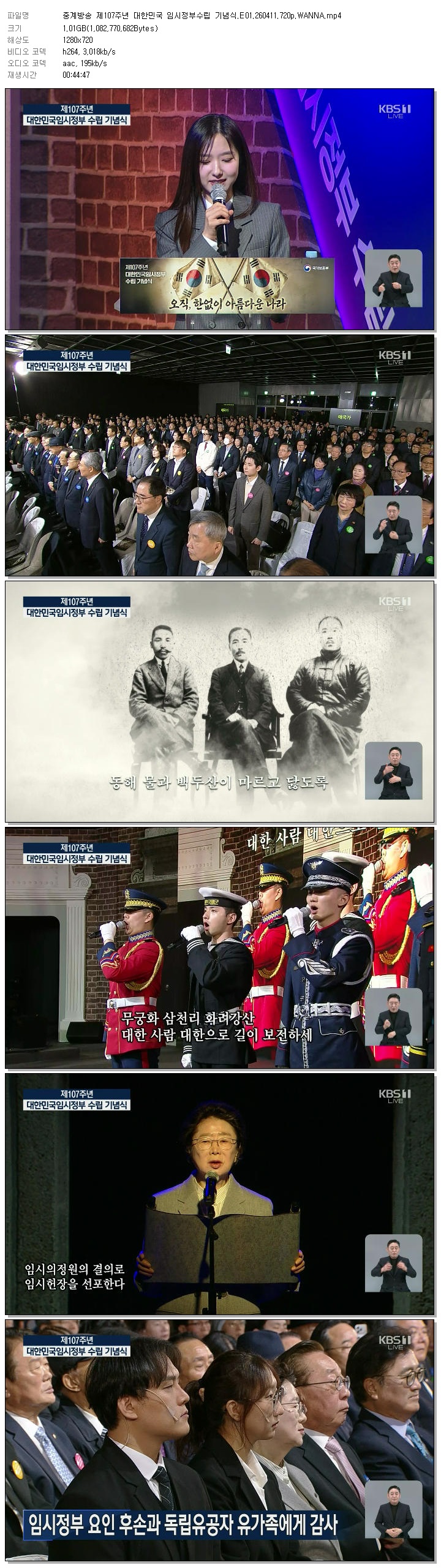 play_circle 동영상 중계방송 제107주년 대한민국 중계방송 제107주년 대한민국 임시정부수립 기념식.E01.260411.720p.WANNA person 바오*** calendar_today 2026.04.11 visibility 6,066 다운로드 1개 파일 folder_zip 중계방송 제107주년 대한민국 임시정부수립 기념식.E01.260411.720p.WANNA.mp4 1.0 GB download