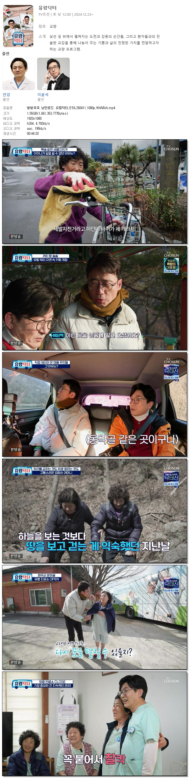play_circle 동영상 방방곡곡 낭만로드 유랑닥터 방방곡곡 낭만로드 유랑닥터.E56.260411.1080p.WANNA person 홀리*** calendar_today 2026.04.11 visibility 5,012 다운로드 1개 파일 folder_zip 방방곡곡 낭만로드 유랑닥터.E56.260411.1080p.WANNA.mp4 1.5 GB download