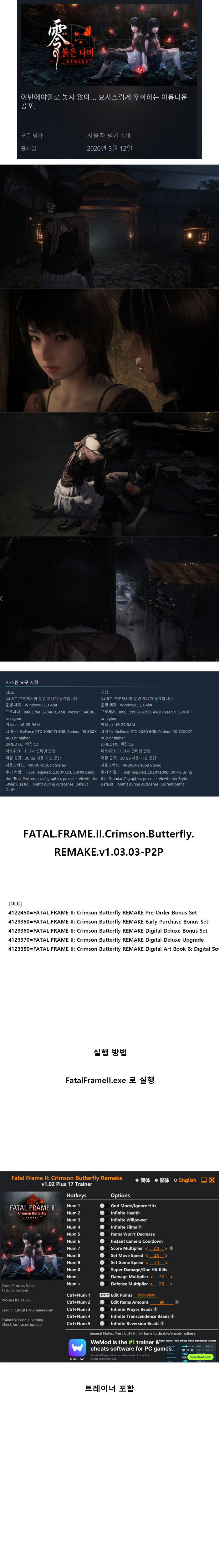 sports_esports 게임 한글무설치 제로 붉은 [한글무설치 제로 ~붉은 나비~ REMAKE + 트레이너 v1.03.03-P2P person js*** calendar_today 2026.04.11 visibility 5,793 복호화 0000팅기거나 오류로 고생하기 싫으시다면 반드시 이 글 그대로 하시길 바랍니다.절대 바탕화면에 다운 받지 마시고 D 드라이브에 윈도우 탐지 제외 Game 폴더를 만들어서다운 받아야 합니다. 그 후 반디집으로 압축 푸세요게임 실행 확인하고 다시 복호화 해서 올립니다.게임 경로에 절대 한글 포함되지 않게 하세요. 오류 뜹니다.게임 저장되는 폴더도 영어로 변경하세요업로드 하는 모든 게임은 실행 확인하고 올립니다. 다운로드 1개 파일 folder_zip FATAL.FRAME.II.Crimson.Butterfly.REMAKE.v1.03.03-P2P.zip.ezc 33.6 GB download