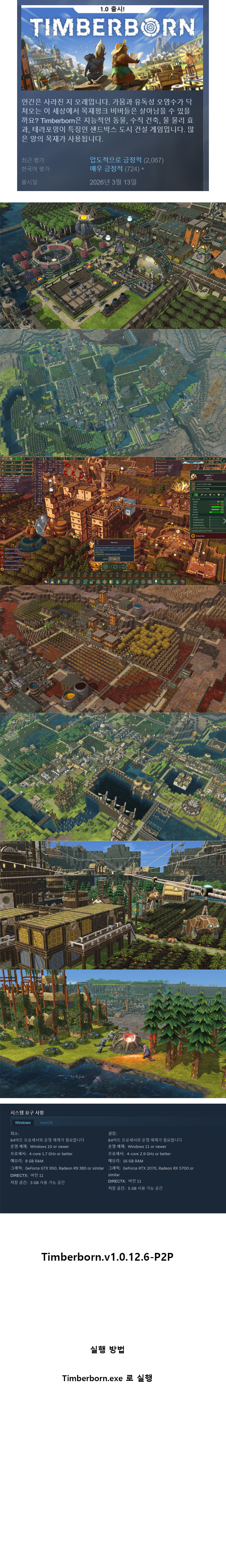 sports_esports 게임 한글무설치 팀버본 P2P [한글무설치] 팀버본 v1.0.12.6-P2P person js*** calendar_today 2026.04.11 visibility 4,419 복호화 0000팅기거나 오류로 고생하기 싫으시다면 반드시 이 글 그대로 하시길 바랍니다.절대 바탕화면에 다운 받지 마시고 D 드라이브에 윈도우 탐지 제외 Game 폴더를 만들어서다운 받아야 합니다. 그 후 반디집으로 압축 푸세요게임 실행 확인하고 다시 복호화 해서 올립니다.게임 경로에 절대 한글 포함되지 않게 하세요. 오류 뜹니다.게임 저장되는 폴더도 영어로 변경하세요업로드 하는 모든 게임은 실행 확인하고 올립니다. 다운로드 1개 파일 folder_zip Timberborn.v1.0.12.6-P2P.zip.ezc 1.6 GB download