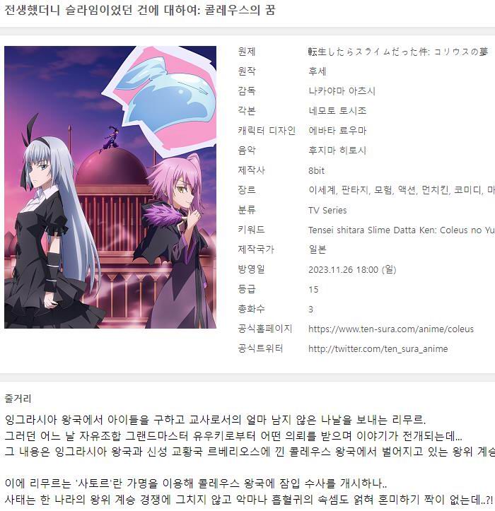 auto_awesome 애니 전생했더니 슬라임이었던 건에 전생했더니 슬라임이었던 건에 대하여 - 콜레우스의 꿈 2023 (1~3화 완결) person 인생*** calendar_today 2026.04.11 visibility 7,434 다운로드 6개 파일 folder_zip [Ohys-Raws] Tensei Shitara Slime Datta Ken Coleus no Yume - 01 (WEB 1920x1080 x264 AAC).mp4 2.2 GB download folder_zip [Ohys-Raws] Tensei Shitara Slime Datta Ken Coleus no Yume - 02 (WEB 1920x1080 x264 AAC).mp4 download folder_zip [Ohys-Raws] Tensei Shitara Slime Datta Ken Coleus no Yume - 03 (WEB 1920x1080 x264 AAC).mp4 download folder_zip [Ohys-Raws] Tensei Shitara Slime Datta Ken Coleus no Yume - 01 (WEB 1920x1080 x264 AAC).smi download folder_zip [Ohys-Raws] Tensei Shitara Slime Datta Ken Coleus no Yume - 02 (WEB 1920x1080 x264 AAC).smi download folder_zip [Ohys-Raws] Tensei Shitara Slime Datta Ken Coleus no Yume - 03 (WEB 1920x1080 x264 AAC).smi download