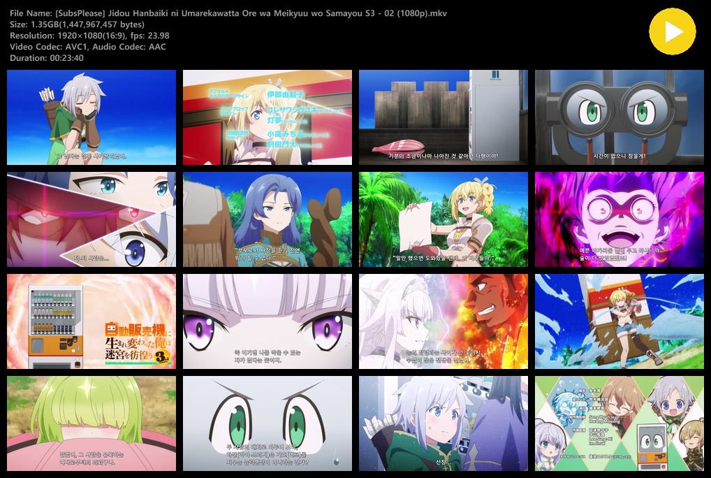 auto_awesome 애니 자동판매기로 다시 태어난 자동판매기로 다시 태어난 나는 미궁을 방랑한다 3기 (2026) - 02 (1920x1080) person zz*** calendar_today 2026.04.11 visibility 5,304 다운로드 2개 파일 folder_zip [SubsPlease] Jidou Hanbaiki ni Umarekawatta Ore wa Meikyuu wo Samayou S3 - 02 (1080p).mkv 1.3 GB download folder_zip [SubsPlease] Jidou Hanbaiki ni Umarekawatta Ore wa Meikyuu wo Samayou S3 - 02 (1080p).srt download