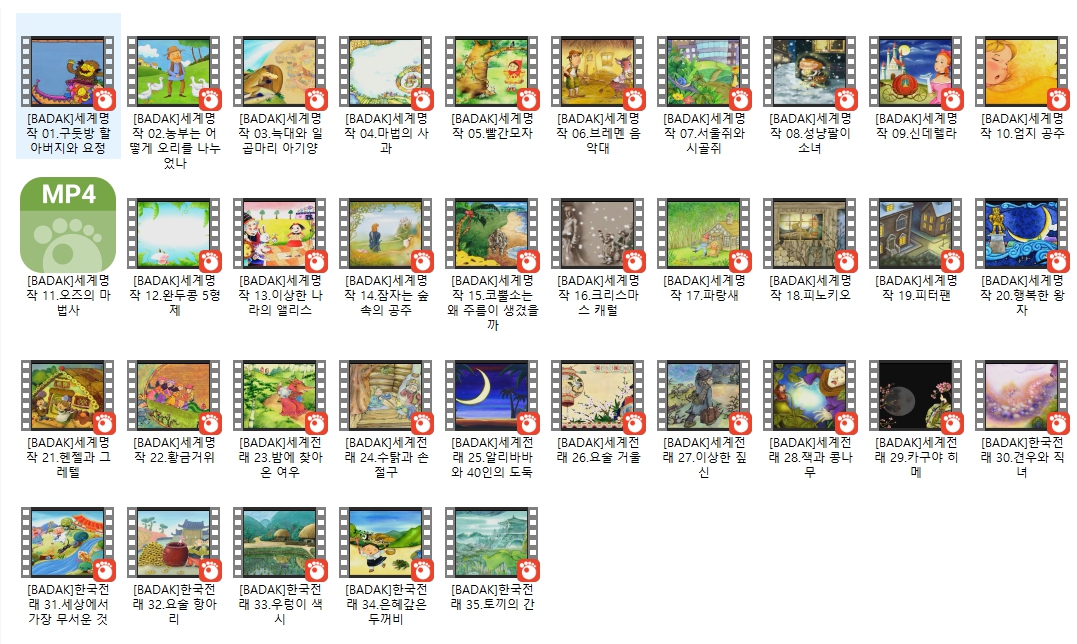 school 교육 세계명작동화 세계전래동화 한국전래동화 [세계명작동화 + 세계전래동화+ 한국전래동화] 아이 교육용 자료 1~35편 person th*** calendar_today 2026.04.11 visibility 3,308 다운로드 35개 파일 folder_zip [BADAK]세계명작 01.구둣방 할아버지와 요정.mp4 1.5 GB download folder_zip [BADAK]세계명작 02.농부는 어떻게 오리를 나누었나.mp4 download folder_zip [BADAK]세계명작 03.늑대와 일곱마리 아기양.mp4 download folder_zip [BADAK]세계명작 04.마법의 사과.mp4 download folder_zip [BADAK]세계명작 05.빨간모자.mp4 download folder_zip [BADAK]세계명작 06.브레멘 음악대.mp4 download folder_zip [BADAK]세계명작 07.서울쥐와 시골쥐.mp4 download folder_zip [BADAK]세계명작 08.성냥팔이 소녀.mp4 download folder_zip [BADAK]세계명작 09.신데렐라.mp4 download folder_zip [BADAK]세계명작 10.엄지 공주.mp4 download folder_zip [BADAK]세계명작 11.오즈의 마법사.mp4 download folder_zip [BADAK]세계명작 12.완두콩 5형제.mp4 download folder_zip [BADAK]세계명작 13.이상한 나라의 앨리스.mp4 download folder_zip [BADAK]세계명작 14.잠자는 숲속의 공주.mp4 download folder_zip [BADAK]세계명작 15.코뿔소는 왜 주름이 생겼을까.mp4 download folder_zip [BADAK]세계명작 16.크리스마스 캐럴.mp4 download folder_zip [BADAK]세계명작 17.파랑새.mp4 download folder_zip [BADAK]세계명작 18.피노키오.mp4 download folder_zip [BADAK]세계명작 19.피터팬.mp4 download folder_zip [BADAK]세계명작 20.행복한 왕자.mp4 download folder_zip [BADAK]세계명작 21.헨젤과 그레텔.mp4 download folder_zip [BADAK]세계명작 22.황금거위.mp4 download folder_zip [BADAK]세계전래 23.밤에 찾아온 여우.mp4 download folder_zip [BADAK]세계전래 24.수탉과 손절구.mp4 download folder_zip [BADAK]세계전래 25.알리바바와 40인의 도둑.mp4 download folder_zip [BADAK]세계전래 26.요술 거울.mp4 download folder_zip [BADAK]세계전래 27.이상한 짚신.mp4 download folder_zip [BADAK]세계전래 28.잭과 콩나무.mp4 download folder_zip [BADAK]세계전래 29.카구야 히메.mp4 download folder_zip [BADAK]한국전래 30.견우와 직녀.mp4 download folder_zip [BADAK]한국전래 31.세상에서 가장 무서운 것.mp4 download folder_zip [BADAK]한국전래 32.요술 항아리.mp4 download folder_zip [BADAK]한국전래 33.우렁이 색시.mp4 download folder_zip [BADAK]한국전래 34.은혜갚은 두꺼비.mp4 download folder_zip [BADAK]한국전래 35.토끼의 간.mp4 download