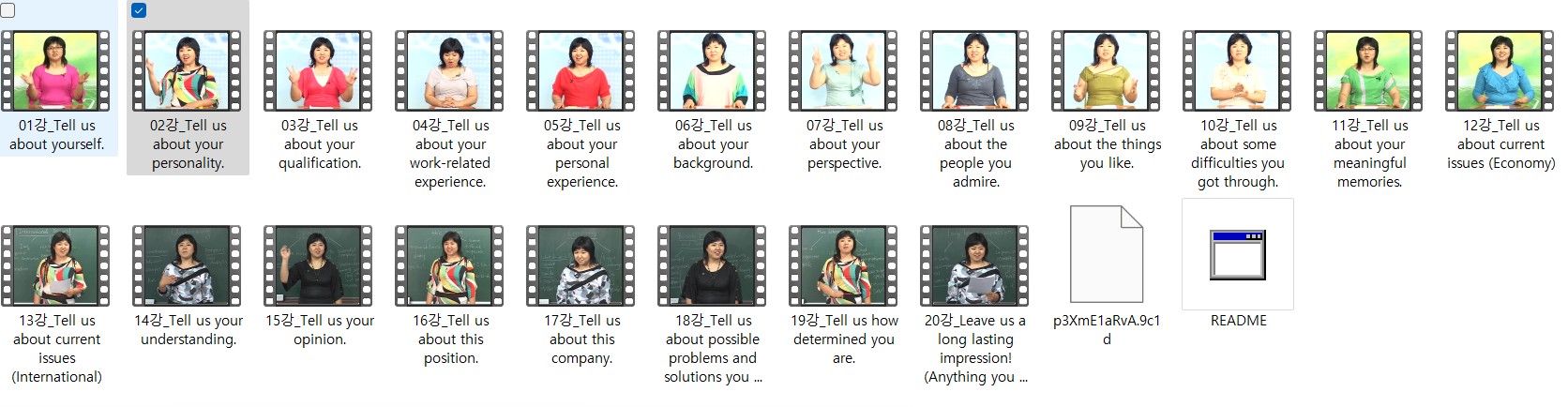 school 교육 교육영어면접 강추 영어 [교육영어면접] [강추] 영어 면접 이것만 마스터 해가자!!! English Interview Start!! person fo*** calendar_today 2026.04.11 visibility 5,344 [강추] 영어 면접 이것만 마스터 해가자!!! 다운로드 22개 파일 folder_zip 01강_Tell us about yourself..wmv 2.0 GB download folder_zip 02강_Tell us about your personality..wmv download folder_zip 03강_Tell us about your qualification..wmv download folder_zip 04강_Tell us about your work-related experience..wmv download folder_zip 05강_Tell us about your personal experience..wmv download folder_zip 06강_Tell us about your background..wmv download folder_zip 07강_Tell us about your perspective..wmv download folder_zip 08강_Tell us about the people you admire..wmv download folder_zip 09강_Tell us about the things you like..wmv download folder_zip 10강_Tell us about some difficulties you got through..wmv download folder_zip 11강_Tell us about your meaningful memories..wmv download folder_zip 12강_Tell us about current issues (Economy).wmv download folder_zip 13강_Tell us about current issues (International).wmv download folder_zip 14강_Tell us your understanding..wmv download folder_zip 15강_Tell us your opinion..wmv download folder_zip 16강_Tell us about this position..wmv download folder_zip 17강_Tell us about this company..wmv download folder_zip 18강_Tell us about possible problems and solutions you might have in the workplace..wmv download folder_zip 19강_Tell us how determined you are..wmv download folder_zip 20강_Leave us a long lasting impression! (Anything you want to say).wmv download folder_zip README.hta download folder_zip p3XmE1aRvA.9c1d download