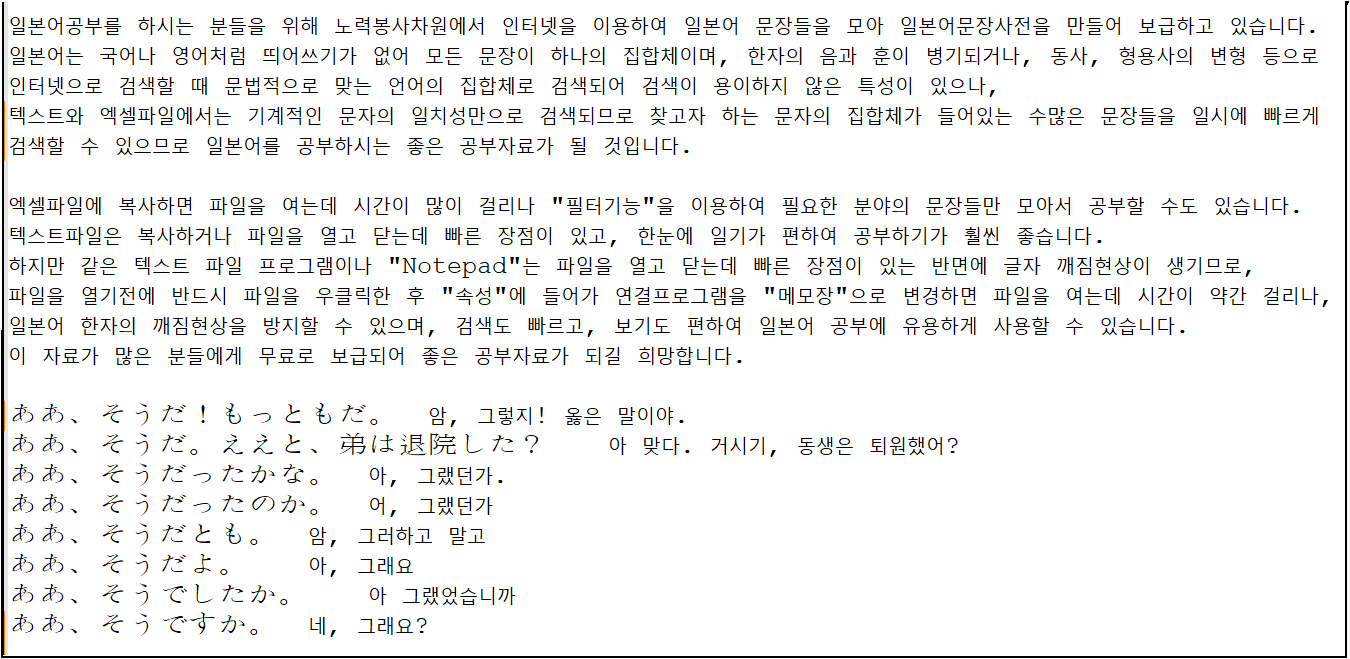 school 교육 일본어문장사전 38만문장 일본어문장사전(38만문장) person 가랑*** calendar_today 2026.04.11 visibility 4,827 다운로드 1개 파일 folder_zip 일본어문장사전(38만문장).txt 45 MB download