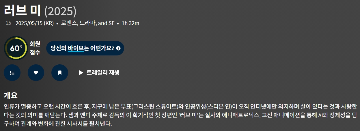 movie 영화 러브 멸종 후의 러브 미 "멸종 후의 사랑! 데이터로 시작해 가슴으로 끝나는 두 기계의 서사시" person gg*** calendar_today 2026.04.11 visibility 6,055 다운로드 2개 파일 folder_zip 러브 미.mkv 600 MB download folder_zip 러브 미.srt download