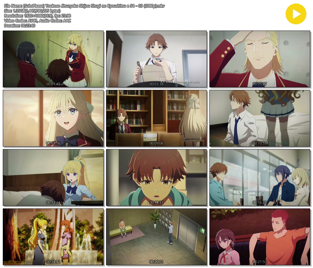 auto_awesome 애니 SubsPlease 어서 오세요 [SubsPlease] 어서 오세요 실력지상주의 교실에 4기 2학년 1학기 - 03 (1920x1080) person 에어*** calendar_today 2026.04.11 visibility 3,885 다운로드 2개 파일 folder_zip [SubsPlease] Youkoso Jitsuryoku Shijou Shugi no Kyoushitsu e S4 - 03 (1080p).mkv 1.3 GB download folder_zip [SubsPlease] Youkoso Jitsuryoku Shijou Shugi no Kyoushitsu e S4 - 03 (1080p).smi download