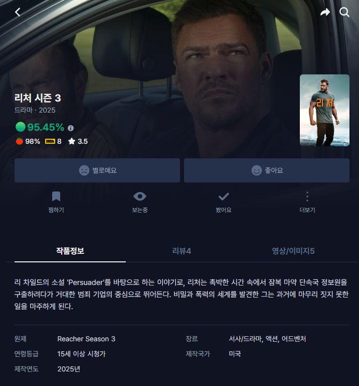 tv 드라마 4K 완결 리처 [4K 완결] 리처 시즌3 E05~E08. 8부작.2025.2160p.AMZN.WEB person ro*** calendar_today 2026.01.01 visibility 3,957 다운로드 8개 파일 folder_zip Reacher.S03E05.AMZN.WEB-DL.2160p.HDR.H265.DDP5.1.mkv 20.4 GB download folder_zip Reacher.S03E05.AMZN.WEB-DL.2160p.HDR.H265.DDP5.1.srt download folder_zip Reacher.S03E06.AMZN.WEB-DL.2160p.HDR.H265.DDP5.1.mkv download folder_zip Reacher.S03E06.AMZN.WEB-DL.2160p.HDR.H265.DDP5.1.srt download folder_zip Reacher.S03E07.AMZN.WEB-DL.2160p.HDR.H265.DDP5.1.mkv download folder_zip Reacher.S03E07.AMZN.WEB-DL.2160p.HDR.H265.DDP5.1.srt download folder_zip Reacher.S03E08.AMZN.WEB-DL.2160p.HDR.H.265.DDP5.1.mkv download folder_zip Reacher.S03E08.AMZN.WEB-DL.2160p.HDR.H.265.DDP5.1.srt download