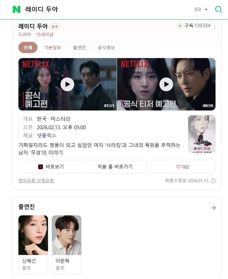 tv 드라마 1080p 레이디 두아 1080p 레이디 두아 E01-E08 통합6 신혜선 이준혁 person 하늘*** calendar_today 2026.01.01 visibility 3,583 다운로드 1개 파일 folder_zip 1080p 레이디 두아 E01-E08 통합6 신혜선 이준혁.mp4 6.6 GB download