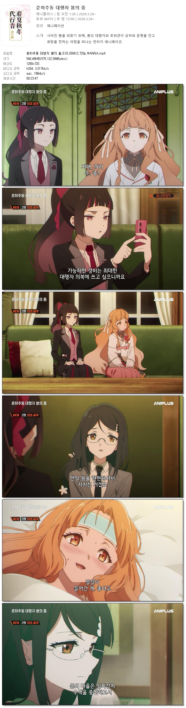 auto_awesome 애니 춘하추동 대행자 봄의 춘하추동 대행자 봄의 춤.E03.260412.720p.WANNA person 바오*** calendar_today 2026.04.11 visibility 3,712 다운로드 1개 파일 folder_zip 춘하추동 대행자 봄의 춤.E03.260412.720p.WANNA.mp4 548 MB download