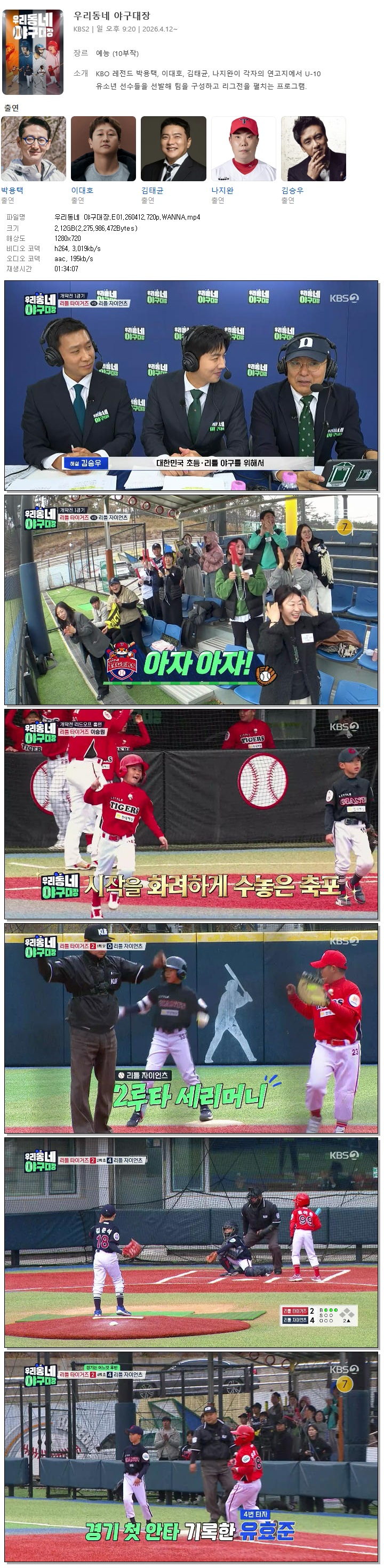 play_circle 동영상 우리동네 야구대장 E01 우리동네 야구대장.E01.260412.720p.WANNA person 바오*** calendar_today 2026.04.12 visibility 5,486 다운로드 1개 파일 folder_zip 우리동네 야구대장.E01.260412.720p.WANNA.mp4 2.1 GB download