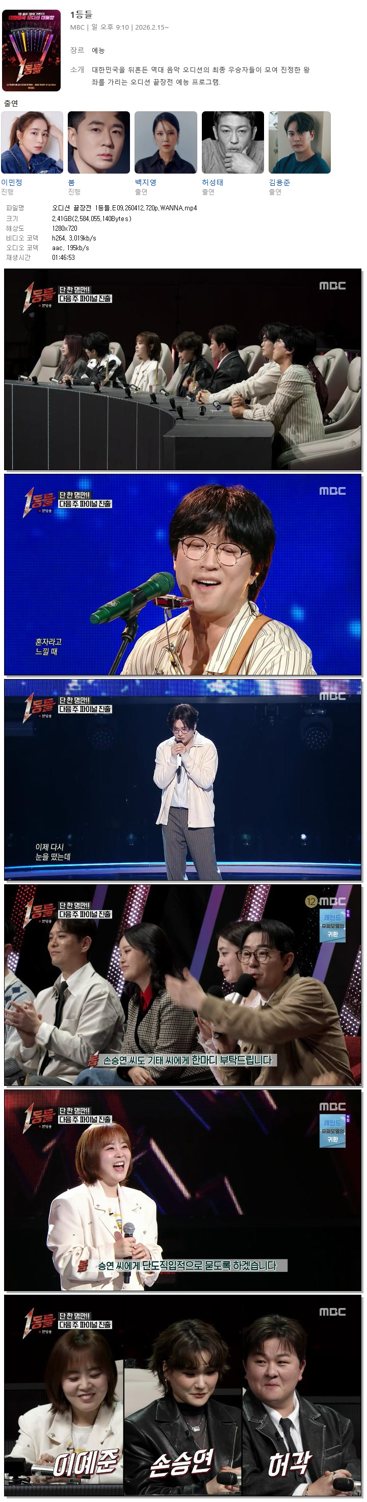 play_circle 동영상 오디션 끝장전 1등들 오디션 끝장전 1등들.E09.260412.720p.WANNA person 바오*** calendar_today 2026.04.12 visibility 5,631 다운로드 1개 파일 folder_zip 오디션 끝장전 1등들.E09.260412.720p.WANNA.mp4 2.4 GB download