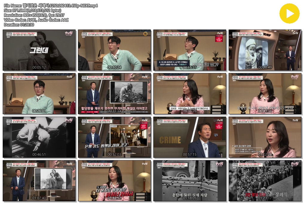play_circle 동영상 벌거벗은 세계사 E250 벌거벗은 세계사.E250.260413.450p-NEXT person se*** calendar_today 2026.04.13 visibility 4,628 다운로드 1개 파일 folder_zip 벌거벗은 세계사.E250.260413.450p-NEXT.mp4 971 MB download