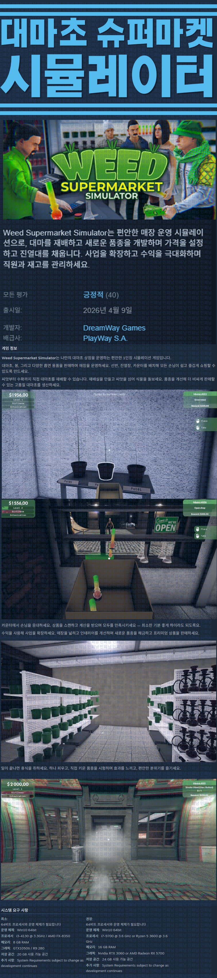 sports_esports 게임 한글무설치 대마초 슈퍼마켓 [한글무설치] 대마초 슈퍼마켓 시뮬레이터 v689 person ze*** calendar_today 2026.04.13 visibility 4,992 실행Weed Supermarket Simulator.exe26.04.09 신작 이지크립트:0000 다운로드 1개 파일 folder_zip Weed Supermarket Simulator.7z.ezc 1.3 GB download