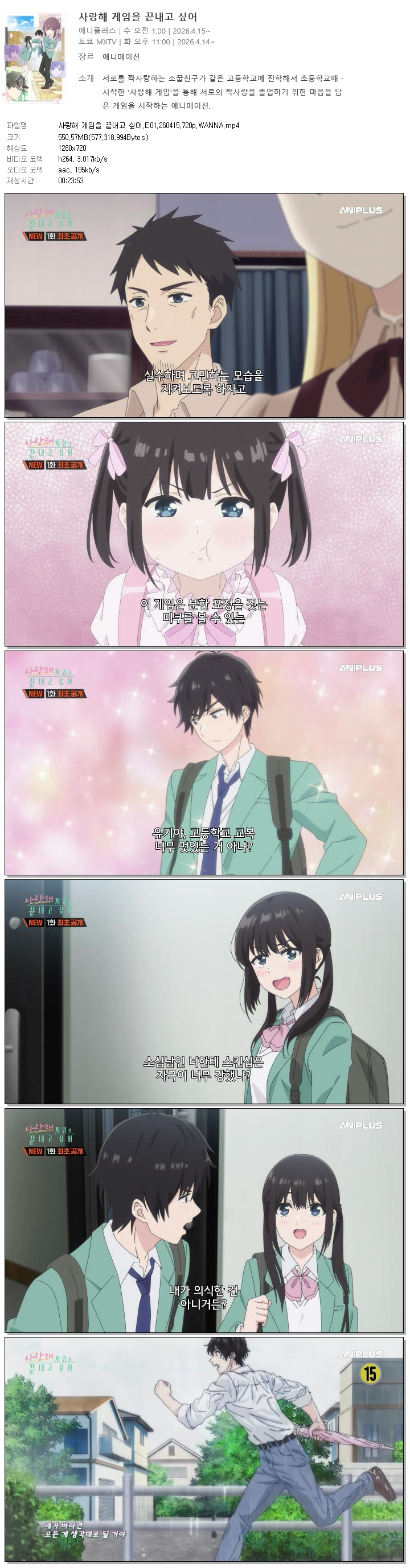 auto_awesome 애니 사랑해 게임을 끝내고 사랑해 게임을 끝내고 싶어.E01.260415.720p.WANNA person 바오*** calendar_today 2026.04.14 visibility 5,442 다운로드 1개 파일 folder_zip 사랑해 게임을 끝내고 싶어.E01.260415.720p.WANNA.mp4 551 MB download