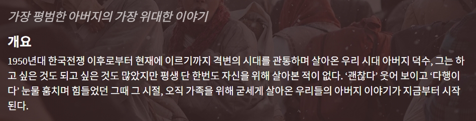 movie 영화 국제시장 가장 평범한 국제시장 "가장 평범한 아버지의 가장 위대한 이야기" person gg*** calendar_today 2026.04.15 visibility 6,010 다운로드 1개 파일 folder_zip 국제시장.mkv 1.3 GB download