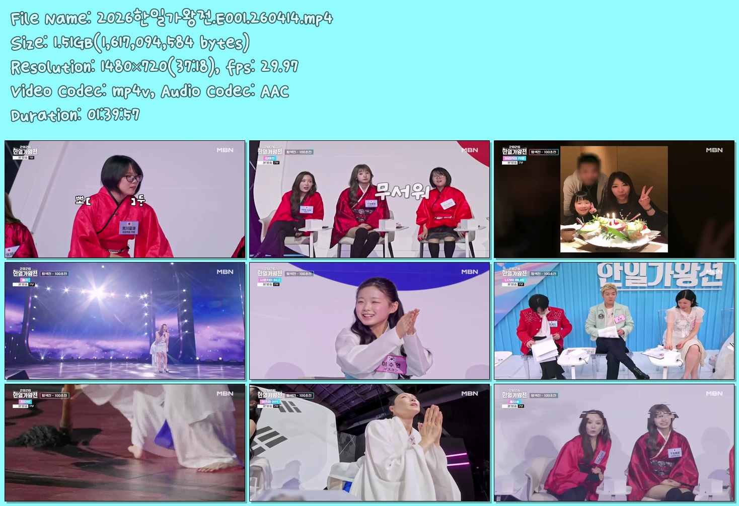 play_circle 동영상 2026한일가왕전 E001 2026한일가왕전.E001.260414 person 러블*** calendar_today 2026.04.15 visibility 6,707 다운로드 1개 파일 folder_zip 2026한일가왕전.E001.260414.mp4 1.5 GB download