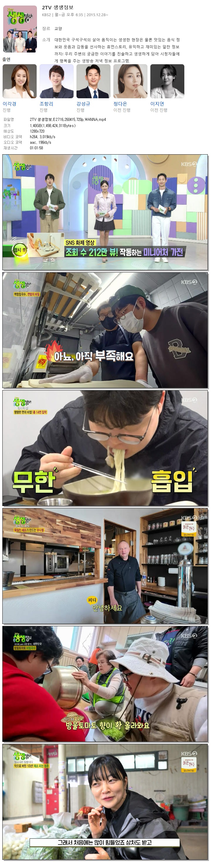 play_circle 동영상 2TV 생생정보 E2716 2TV 생생정보.E2716.260415.720p.WANNA person 바오*** calendar_today 2026.04.15 visibility 6,760 다운로드 1개 파일 folder_zip 2TV 생생정보.E2716.260415.720p.WANNA.mp4 1.4 GB download