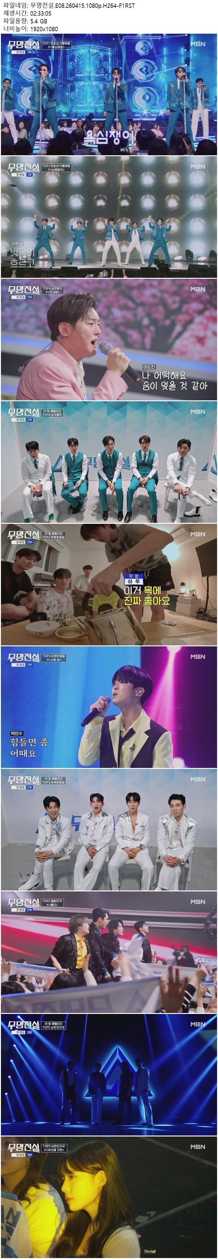 play_circle 동영상 무명전설 E08 H264 무명전설.E08.260415.1080p.H264-F1RST person Ze*** calendar_today 2026.04.15 visibility 5,508 다운로드 1개 파일 folder_zip 무명전설.E08.260415.1080p.H264-F1RST.mp4 5.4 GB download