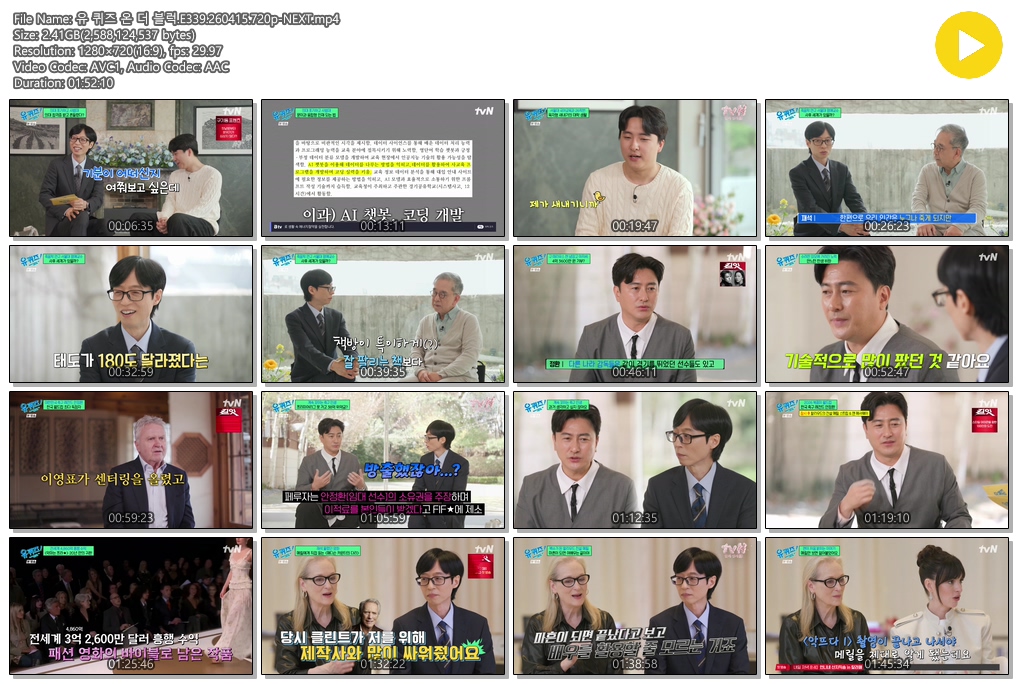 play_circle 동영상 퀴즈 블럭 E339 유 퀴즈 온 더 블럭.E339.260415.720p-NEXT person se*** calendar_today 2026.04.15 visibility 3,806 다운로드 1개 파일 folder_zip 유 퀴즈 온 더 블럭.E339.260415.720p-NEXT.mp4 2.4 GB download