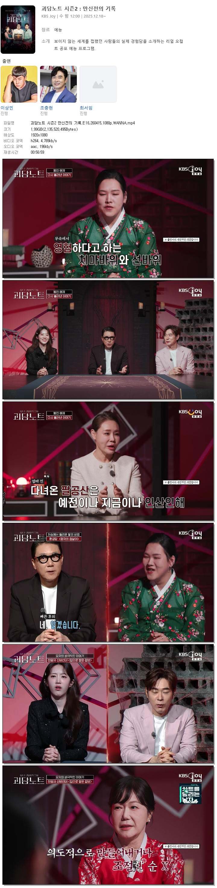 play_circle 동영상 괴담노트 시즌2 만신전의 괴담노트 시즌2 만신전의 기록.E16.260415.1080p.WANNA person 홀리*** calendar_today 2026.04.15 visibility 4,910 다운로드 1개 파일 folder_zip 괴담노트 시즌2 만신전의 기록.E16.260415.1080p.WANNA.mp4 2.0 GB download