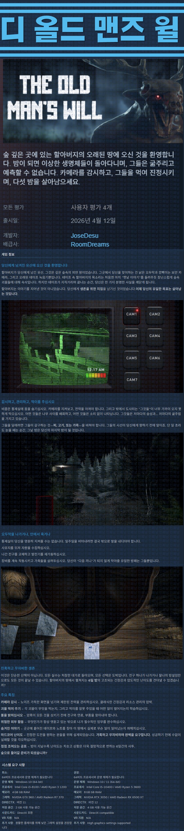sports_esports 게임 한글무설치 올드 맨즈 [한글무설치] 디 올드 맨즈 윌 v20260412 person ze*** calendar_today 2026.04.15 visibility 5,162 실행TheOldMan'sWillexe26.04.12 신작이지크립트:0000 다운로드 1개 파일 folder_zip The Old Mans Will.zip.ezc 1.1 GB download