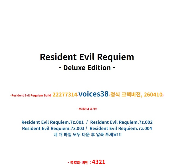 sports_esports 게임 NEWAYZ 레지던트 이블 [NEWAYZ] 레지던트 이블 레퀴엠 person ne*** calendar_today 2026.04.15 visibility 6,980 - https://store.steampowered.com/app/3764200/BIOHAZARD_requiem/ - 구동 확인 - 다운로드 4개 파일 folder_zip Resident Evil Requiem.7z.001.ezc 74.6 GB download folder_zip Resident Evil Requiem.7z.002 download folder_zip Resident Evil Requiem.7z.003 download folder_zip Resident Evil Requiem.7z.004 download auto_awesome 관련 포스트 게임 [NSW] 크립트 카니지 (Crypt Carnage) 킹애***4,240 views 게임 [NSW] 다크 라이트 (Dark Light) 킹애***6,695 views 게임 [NSW] 데드 스트라이드 (Dead Stride) 킹애***6,496 views forum 댓글 send 댓글 등록 sports_esports 게임 목록 전체보기 → progress_activity