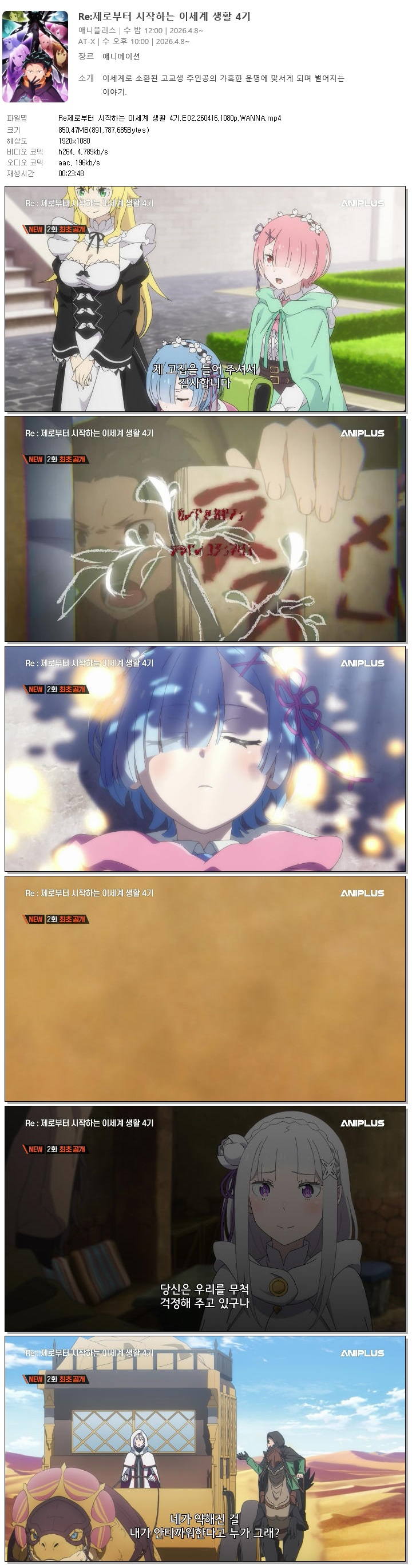 auto_awesome 애니 Re제로부터 시작하는 이세계 Re제로부터 시작하는 이세계 생활 4기.E02.260416.1080p.WANNA person 홀리*** calendar_today 2026.04.15 visibility 4,326 다운로드 1개 파일 folder_zip Re제로부터 시작하는 이세계 생활 4기.E02.260416.1080p.WANNA.mp4 850 MB download