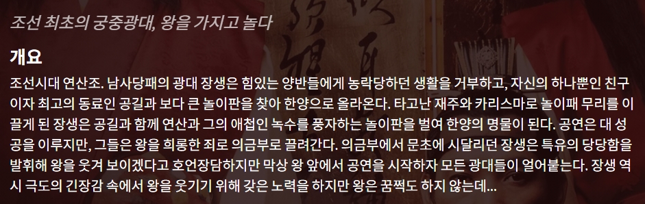 movie 영화 왕의 남자 조선 왕의 남자 "조선 최초의 궁중광대, 왕을 가지고 놀다" person gg*** calendar_today 2026.04.16 visibility 3,528 다운로드 1개 파일 folder_zip 왕의 남자.mkv 2.9 GB download