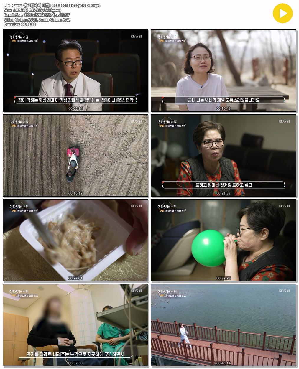play_circle 동영상 변비 몸이 보내는 변비, 몸이 보내는 위험 신호_ 생로병사의 비밀.E992.260415.720p-NEXT person tm*** calendar_today 2026.04.16 visibility 7,984 다운로드 1개 파일 folder_zip 생로병사의 비밀.E992.260415.720p-NEXT.mp4 1.0 GB download