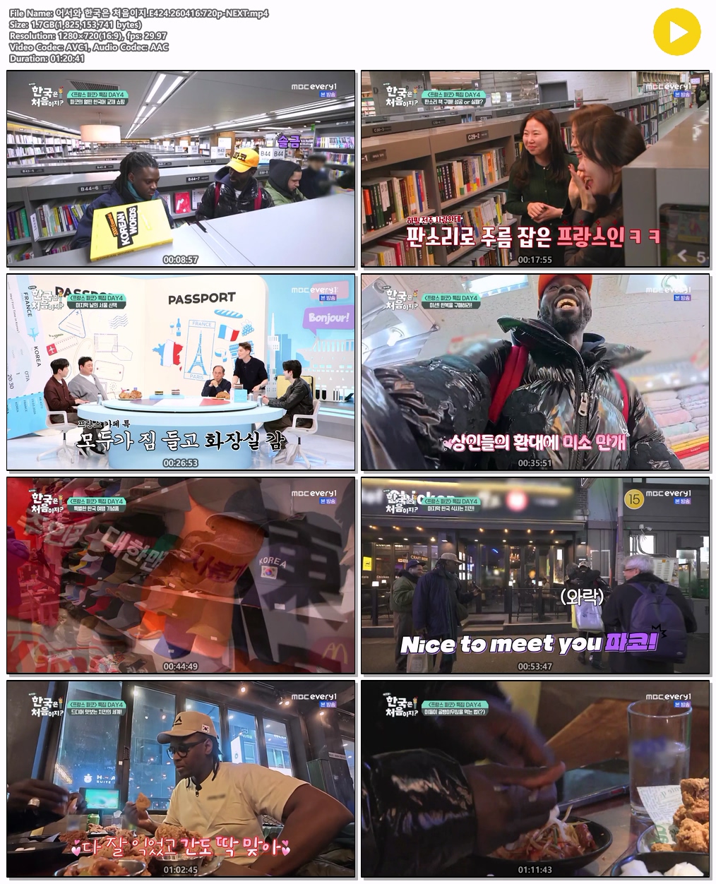 play_circle 동영상 어서와 한국은 처음이지 어서와 한국은 처음이지.E424.260416.720p-NEXT person tm*** calendar_today 2026.04.16 visibility 7,568 다운로드 1개 파일 folder_zip 어서와 한국은 처음이지.E424.260416.720p-NEXT.mp4 1.7 GB download